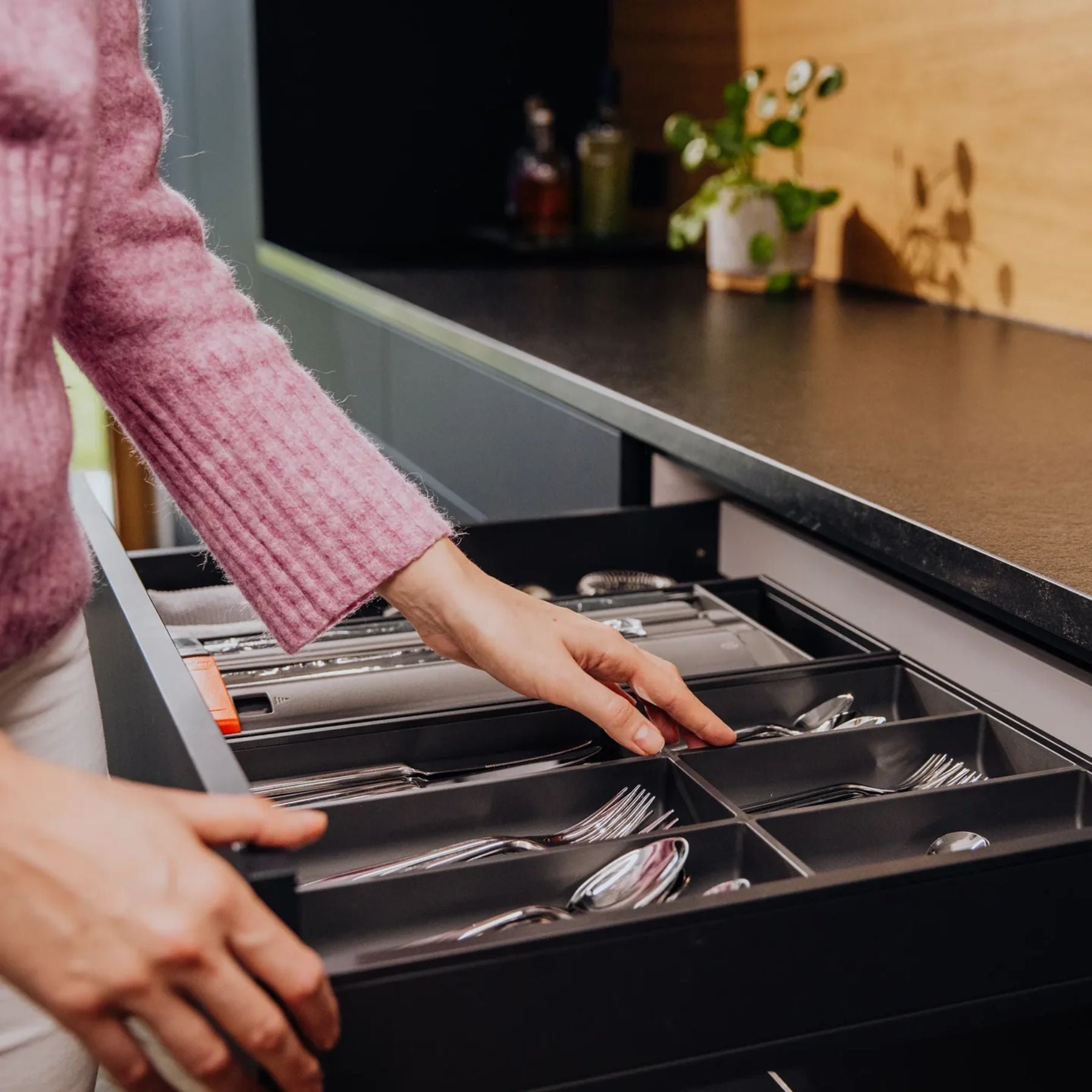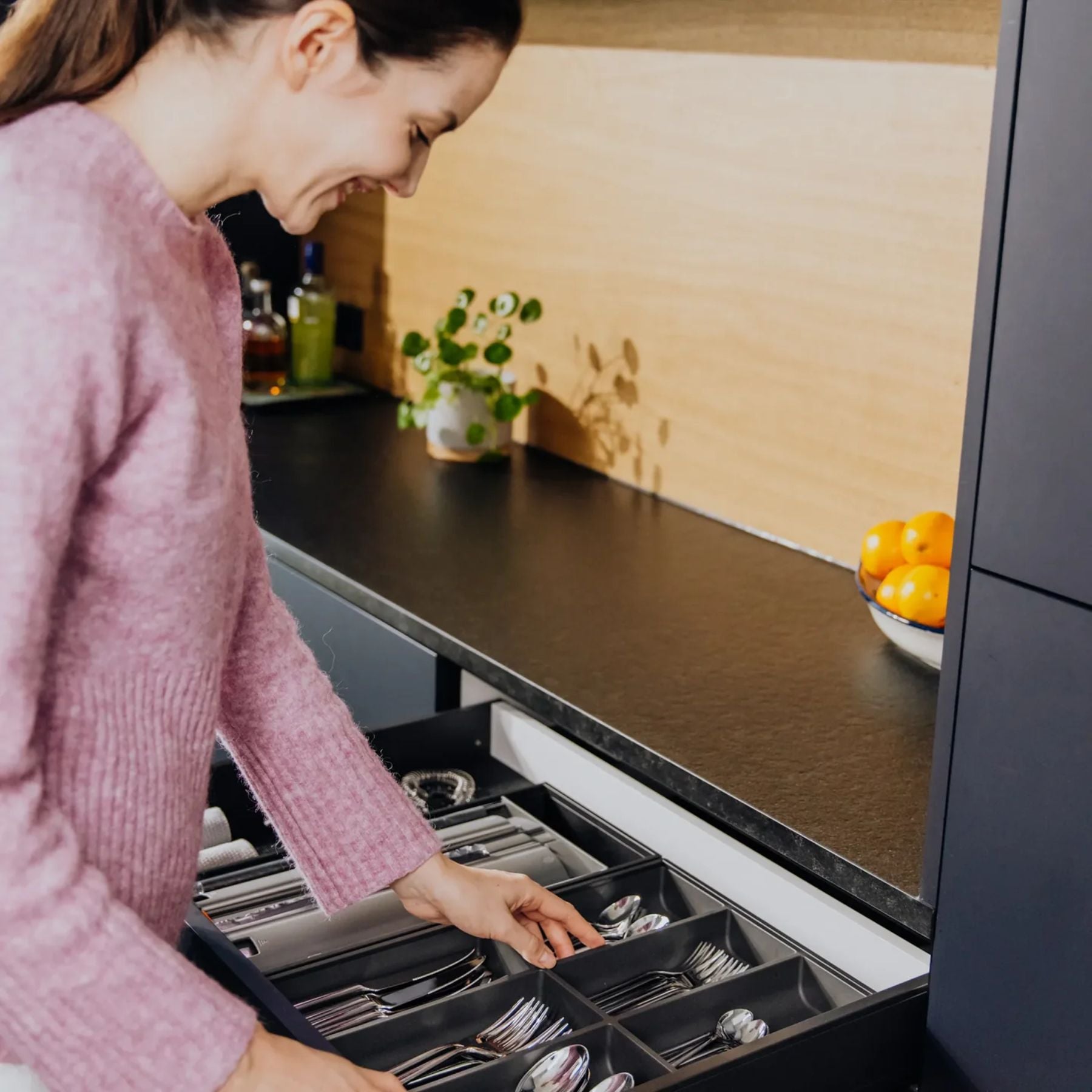Finally order in the cutlery drawer! The stylish organiser ensures that your cutlery is always kept clear and organised. All your knives, forks and spoons can easily fit in the spacious compartments. The timeless design, the high-quality material and the clean lines combine functionality and aesthetics.